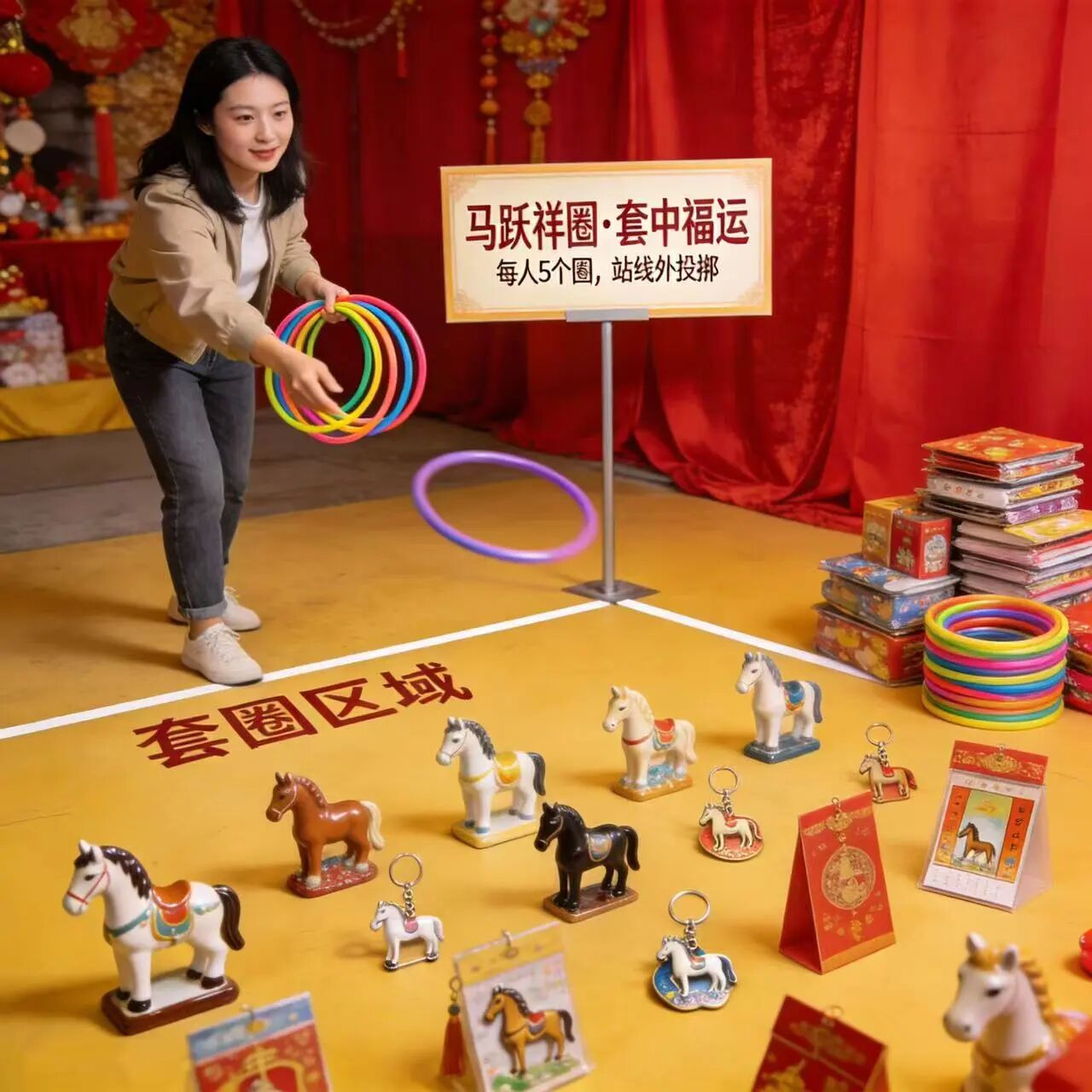 规则:参与者凭傩博专属入场券领取5个圈后,站在指定线外进行套圈,套中即可获得相应纪念品。