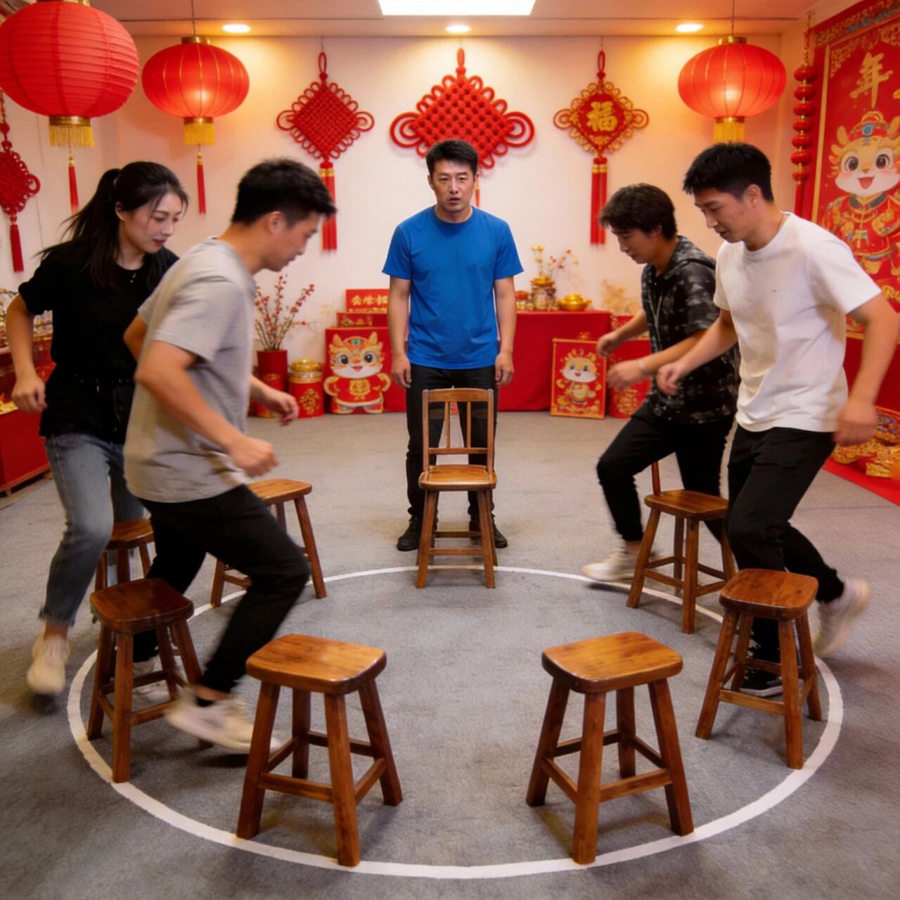 规则:每轮6人参与,放置5张凳子围成圈,播放音乐时绕凳跑,音乐停立即抢凳。未抢到凳者淘汰,逐轮减凳至1人胜出。获胜者可领取纪念品一份。