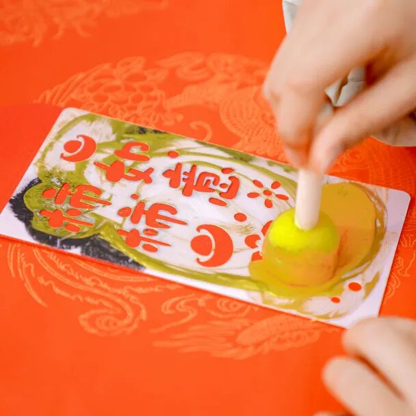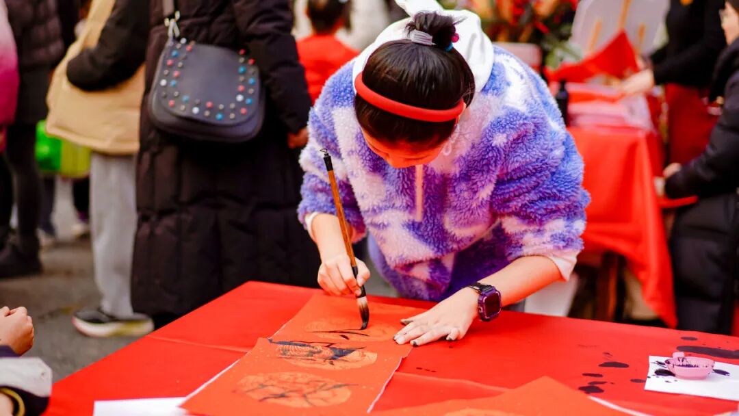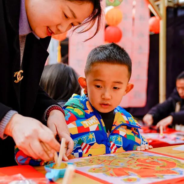 春联拓印区也是热闹非凡,大人与孩子的手共同握住拓印工具。浓墨在红纸上渐渐晕开字迹,“柿柿如意”四个字带着温暖与祝福,成为新年最珍贵的期许。