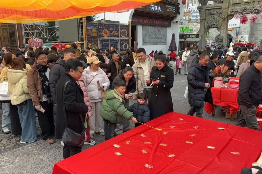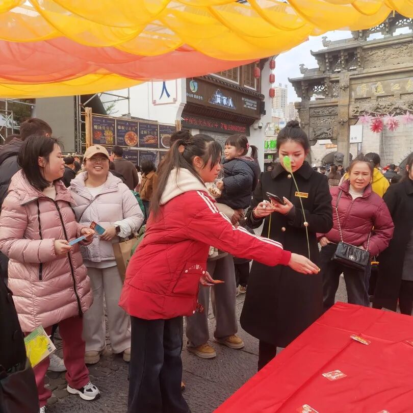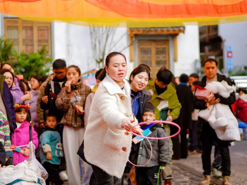 瞧那套圈区域,套圈在空中轻盈划出一道道优美弧线,参与者们全神贯注、屏息凝神。当套圈稳稳套中纪念品时,人群中瞬间爆发出阵阵欢呼:“套中福气啦!”那声音清脆响亮,满是喜悦。