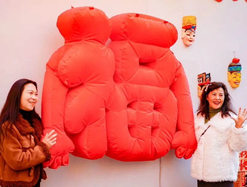 精心打造的主题墙亦成为市民新春打卡新地标,巨型红色“福”字搭配“我是个有福抱的人”趣味标语,吸引众多市民驻足合影,或环抱“福”,或摆出创意手势,在温馨欢乐的氛围中传递“抱福回家”的美好期许。