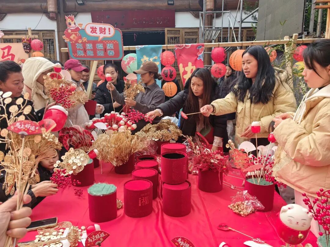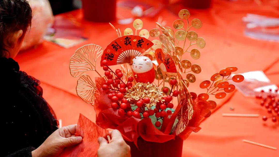 再看那DIY花福抱抱桶区,姑娘们手持红梅与金叶,小心翼翼地将它们插入抱抱桶中,动作轻柔而专注。笑容在嘴角缓缓绽放,比枝头的花朵更添几分鲜活的温柔。