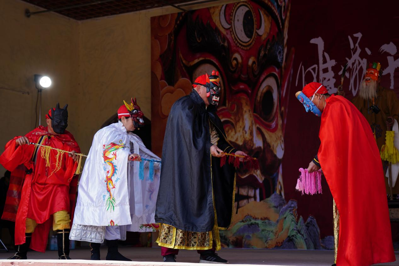 本次展演剧目有正戏与耍戏两种类型,风格多样。正戏演出中,演员们将擒妖降魔、收瘟摄毒的精彩过程,以及民众祈福消灾的心愿,巧妙地融入戏剧表演之中,以比较整饬规范的动作和特定唱腔唱词展现给现场专家与观众。耍戏与祈福消灾的法事无紧密的内在联系,主要为娱乐观众、调节氛围而设立,多表演一些轻松幽默的剧目,内容以插科打诨、风趣诙谐为主,同时也会融入惩恶扬善、劝善行孝等民风民俗故事,寓教于乐。