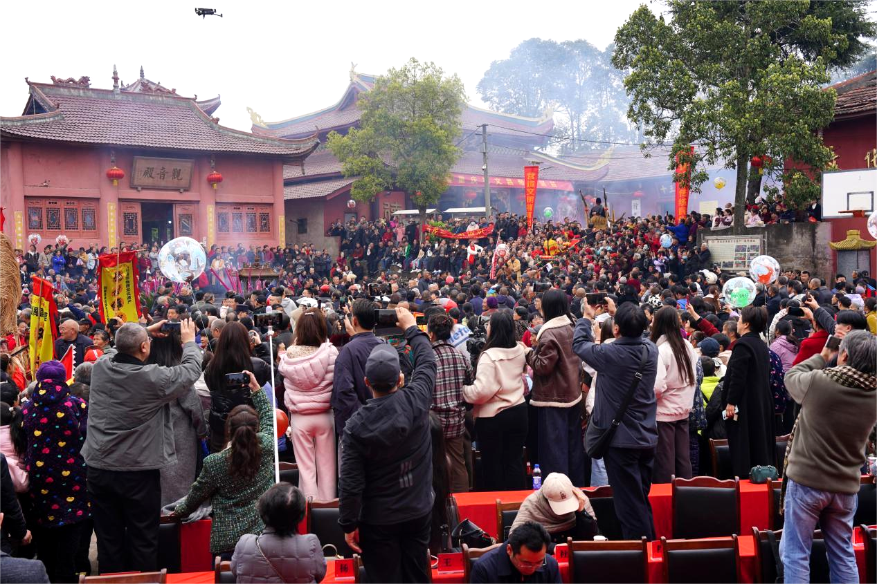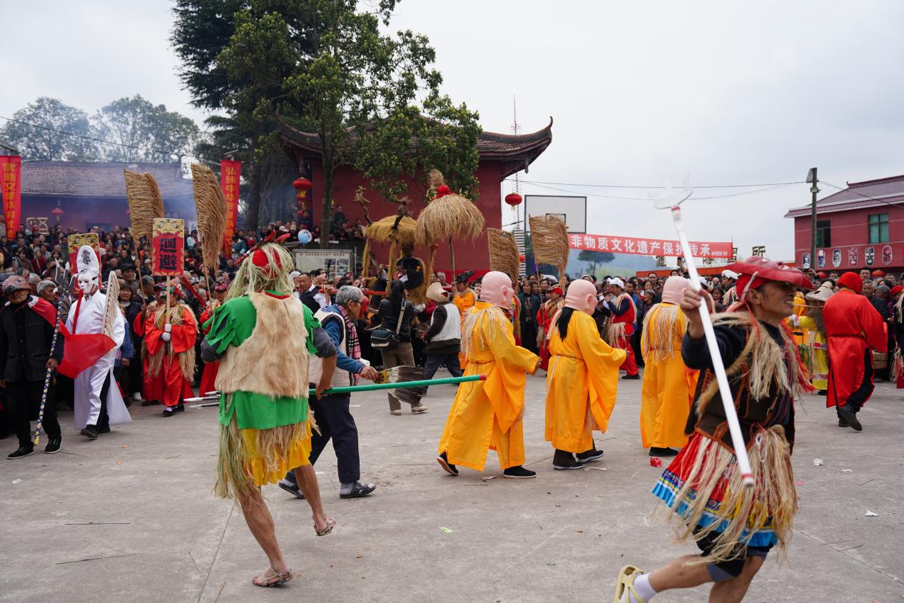 开幕式后,在杨村傩戏文化广场上演出的傩戏《驿官赶斋》,傩技“点天灯”、“过火海”、“过刀桥”、“耍火棍”、“踩油锅”等节目将活动推向高潮,现场人山人海,盛况空前。
