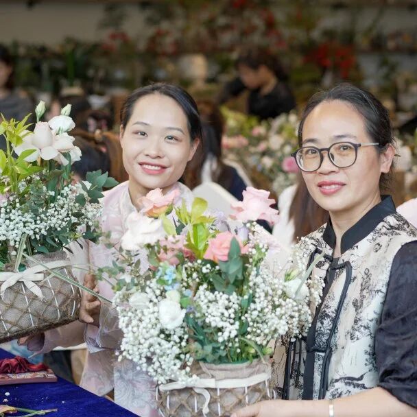 而“花漾春光·雅趣盈堂”的花艺沙龙,则宛如一幅绚丽多彩的画卷,在眼前徐徐展开。参与者们时而低头沉思,在脑海中勾勒着心中春日的模样,那或许是一幅繁花似锦的景象,又或许是一片宁静祥和的田园风光;时而巧手翻飞,如同灵动的音符在指尖跳跃,将各式花材巧妙地组合在一起。以花为媒,以叶衬景,每一件作品都独具韵味,将春日烂漫与心中美好尽数呈现。现场花香四溢,一片欢声笑语。